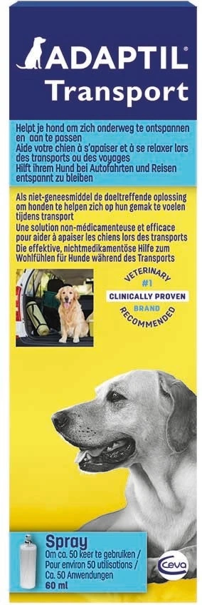 Adaptil Transport biedt ondersteuning bij reisangst en is daarnaast ook ideaal in te zetten in de hond zijn veilige haven tijdens bijvoorbeeld de vuurwerkavond. De werking is klinisch bewezen en wordt aanbevolen door dierenartsen. De spray werkt 4-5 uur. Daarna de behandeling herhalen.