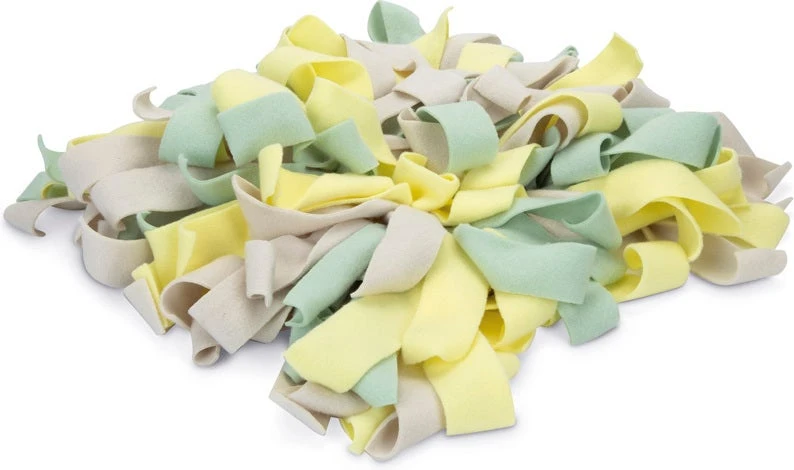 Deze mat bestaat uit allemaal verschillende gekleurde stroken, kort en lang. Doordat de mat is gemaakt van joggingstof, voelt het lekker zacht aan voor de neus. Met een snuffelmat kun je samen met jouw pup spelen, wat ook nog eens de band tussen jullie versterkt.