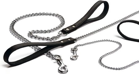 Een kettinglijn voor de hond met schakels, voorzien van een zwart lederen handvat. De ketting heeft een dikte van 2 mm en een lengte van 120 cm. Het handvat heeft een breedte van 12 mm.