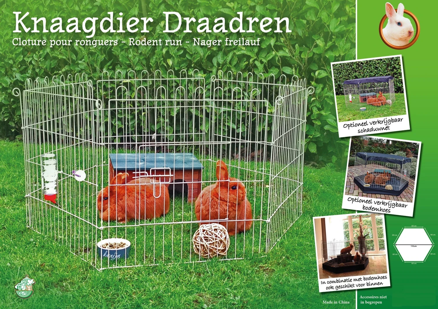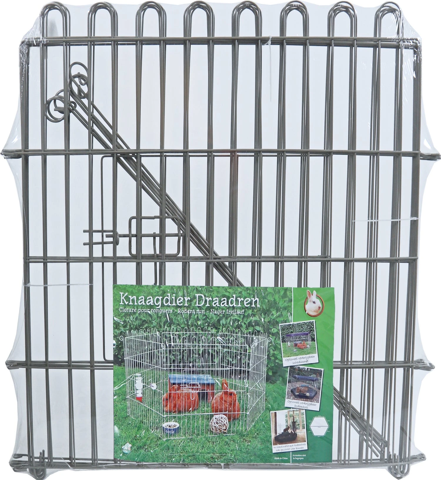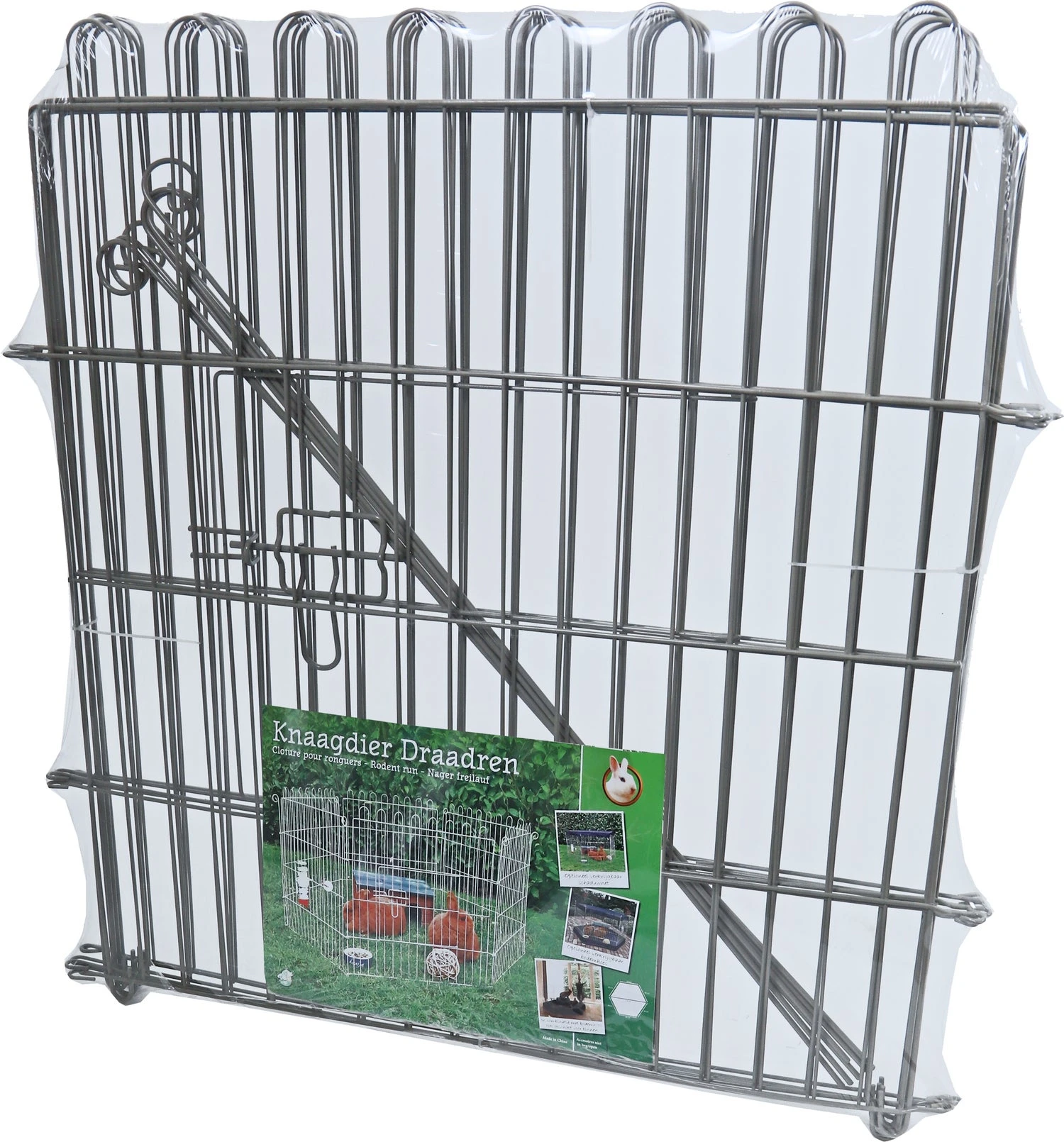 Voor lichaamsbeweging en speelplezier. De metalen konijnenloopren kan zowel op tegels als op gras geplaatst worden. De ren op de tegels plaatsen is goed voor de nagels zodat deze kunnen slijten aan de ruwe ondergrond. Op het gazon kan het dier lekker van het gras smullen. De ren kan bedekt worden met een speciaal afdeknet en of bodemhoes. Afdeknetten en bodemhoezen zijn los verkrijgbaar. Laat uw konijn regelmatig in de ren, zodat het dier voldoende bewegingsvrijheid heeft. Om het konijn op zijn gemak rond te laten lopen is het plaatsen van een huisje om te schuilen aan te bevelen (huisje is niet inbegrepen). De ren bestaat uit 6 panelen met een afmeting van: 63,5 × 60 cm per paneel (hxb), 1 paneel beschikt over een deur.