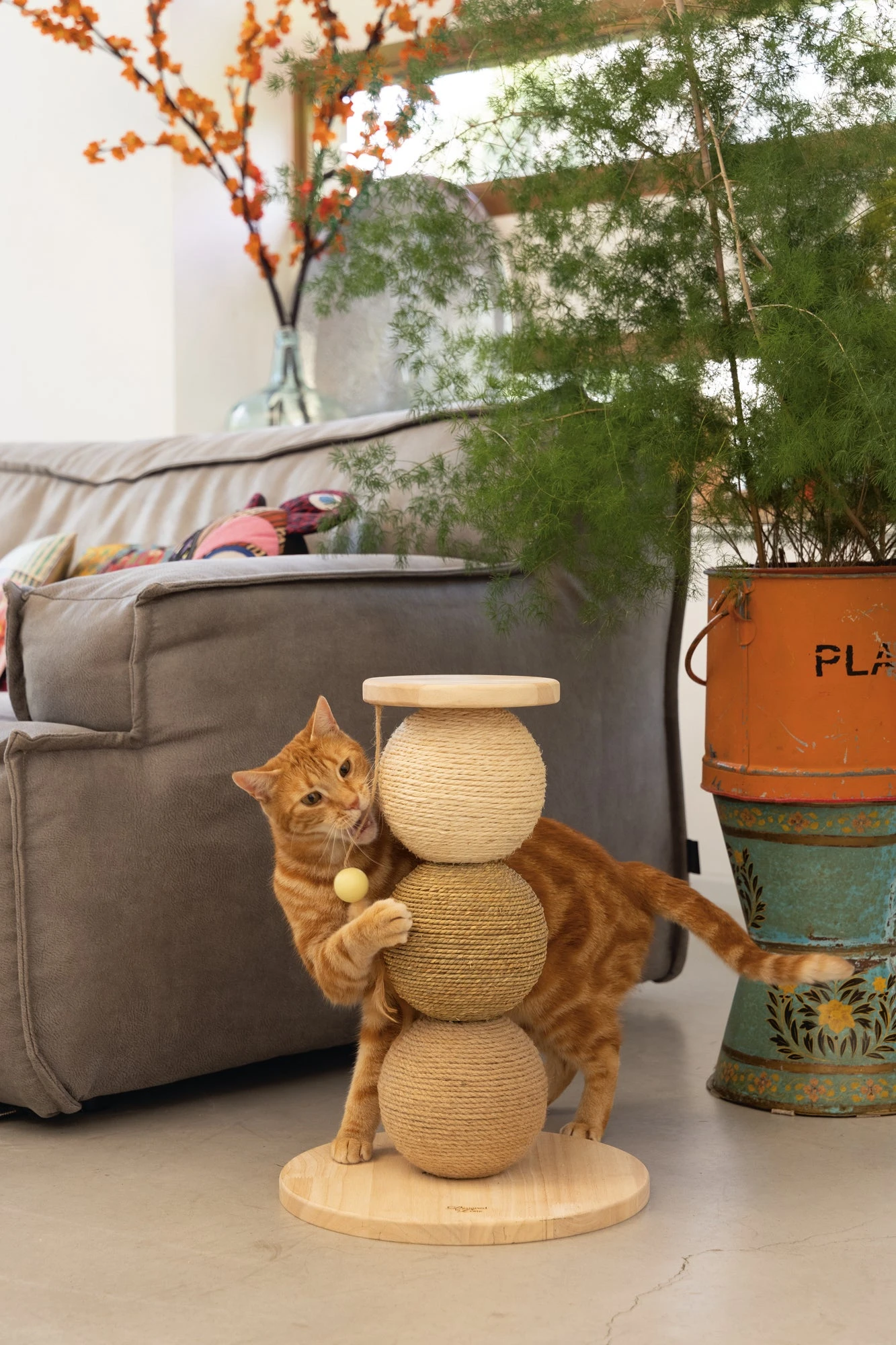 De Designed by Lotte Krabbollen Elio zijn echt een design item voor in je huis, waarmee jouw kat veel krabplezier zal hebben! Elio is gemaakt rubberhout, wat mooi lichtcremig van kleur is. Daarnaast bevat iedere bal een eigen soort touw: jute, sisal of zeegras. Er hangt een leuk speelveertje aan Elio, voor extra speelplezier! Met deze krabbollen doe je niet alleen jouw kat plezier, maar het staat ook echt fantastisch in je interieur! – Gemaakt van rubberhout – Gebruik gemaakt van 3 soorten touw: jute, sisal en zeegras Afmetingen: 34x34x47,5 cm