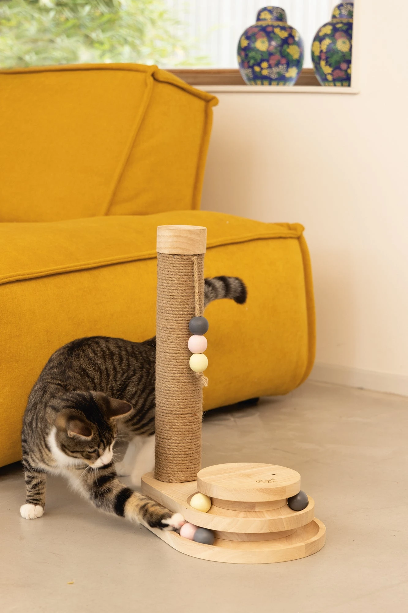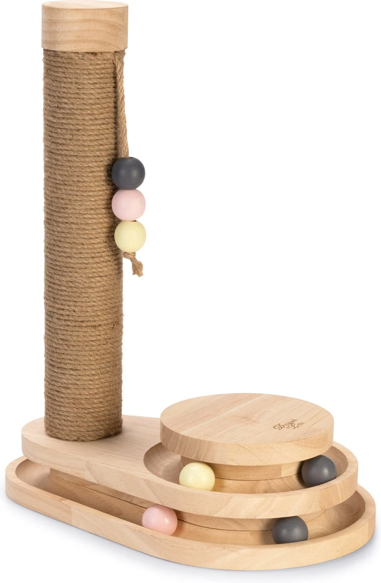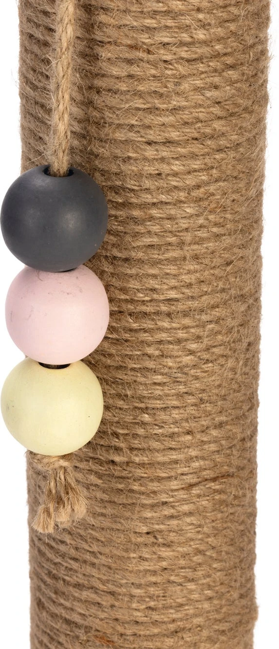 De Designed by Lotte Krabpaal Inez is een multifunctionele krabpaal. Deze krabpaal heeft naast de gebruikelijke krabstam ook nog een leuke speeltoren aan de voet bevestigd. Deze speeltoren is voorzien van balletjes. Zodra jouw kat met zijn poot of snuit tegen de balletjes tikt, zullen deze alle kanten op rollen.