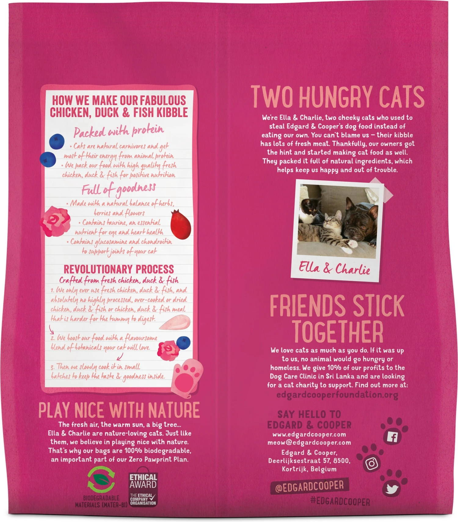Goed eten is top voor lichaam en geest. Niks beter dan vers vlees of verse vis met een eenvoudige mix van natuurlijke ingrediënten. Zeker als het gemaakt is met een hart voor de natuur. Helaas is kattenvoeding vaak overbewerkt en verpakt in plastic. Daar hebben wij het helemaal mee gehad. Jij ook? Geef je pluizenbol dan Edgard & Cooper: écht lekker eten voor honden en katten dat jou, je viervoeters én onze planeet goed doet.