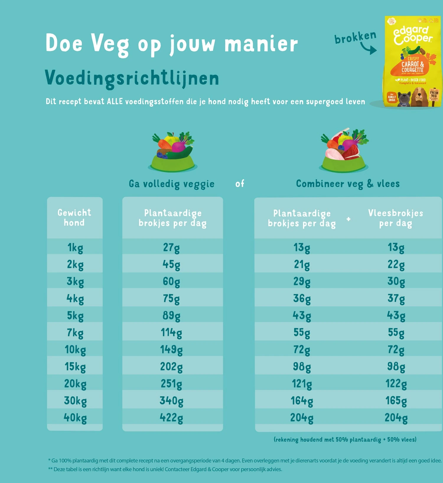 Doe veggie op jouw manier. Je kan plantaardige recepten makkelijk combineren met vlees- en visrecepten of gewoon volledig veggie gaan. Wanneer je volledig overstapt op plantaardig, raden we een overgangsperiode van 4 dagen aan. Tijdens deze periode doe je langzaam steeds meer plantaardige brokjes in de kom van je hond en steeds minder van je huidige voer.