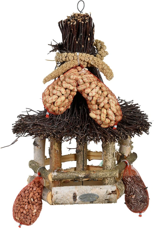 Lok vogels naar de tuin met deze hangende voedertafel inclusief vogelvoer. Dit pakket bestaat uit een voedertafel, 1 netje gestreepte zonnebloempitten, 2 netjes rode pinda’s, 1 netje doppinda’s, 2 stengels trosgierst en 1 vetbol.
