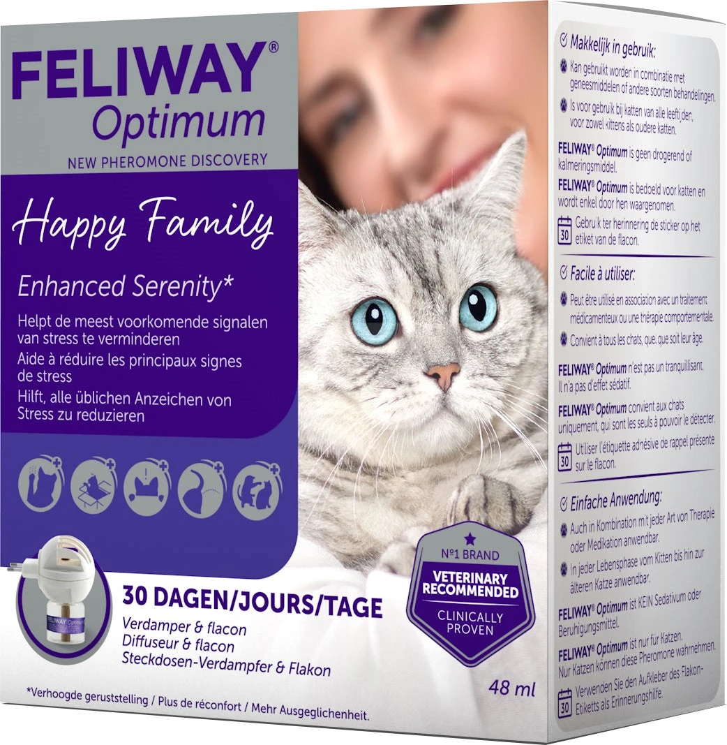 Feliway Optimum bevat het beste van kattenferomonen om alle tekenen van stress aan te pakken en katten beter dan ooit te kalmeren! Het helpt katten zich veilig en vertrouwd te voelen in huis, biedt geruststelling en zorgt voor harmonie tussen meerdere katten in huis.