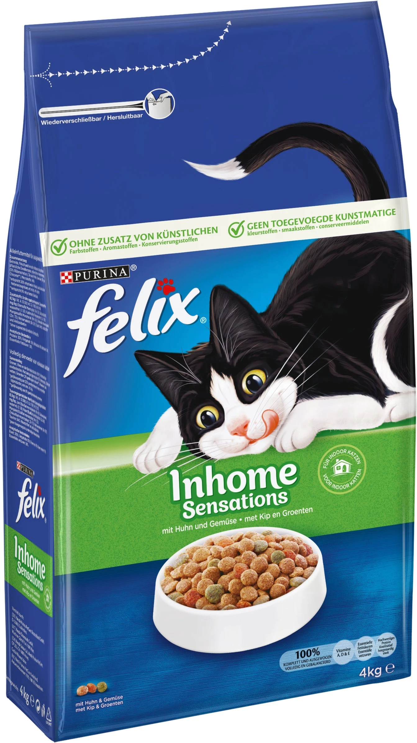 Dit kattenvoer is 100% volledig en uitgebalanceerd. Dat is nog niet alles! Met Felix Inhome Sensations weet je dat je geliefde deugniet, die het liefste binnen is, alle smakelijke goedheid krijgt die hij nodig heeft om te blijven genieten van een sensationeel leven vol kattenkwaad!