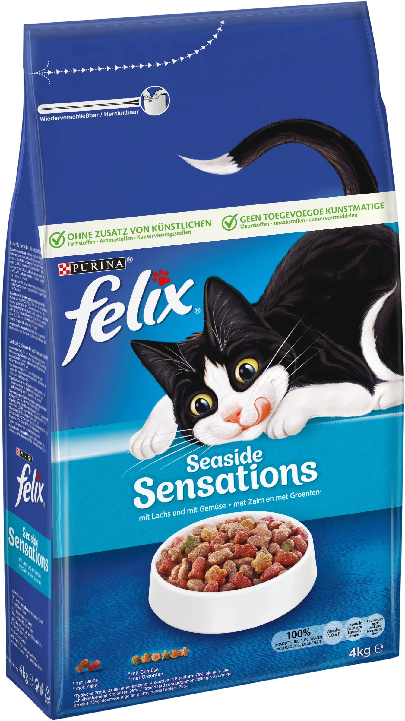 | Ingrediënten | Granen, Vlees en dierlijke bijproducten, Plantaardige eiwitextracten, Oliën en vetten, Plantaardige bijproducten, Vis en visbijproducten (1,6%*), Mineralen, Groenten (0,6%**), Gist. *gelijkwaardig aan 4% vis en visbijproducten, met min. 4% zalm in de visvormige brokjes, gelijkwaardig aan 3% zalm in het product **gelijkwaardig aan 4% gerehydrateerde groenten in de bloemvormige en platte, ronde brokjes, met 0,15% gelijkwaardig aan 1% groenten in het product. |