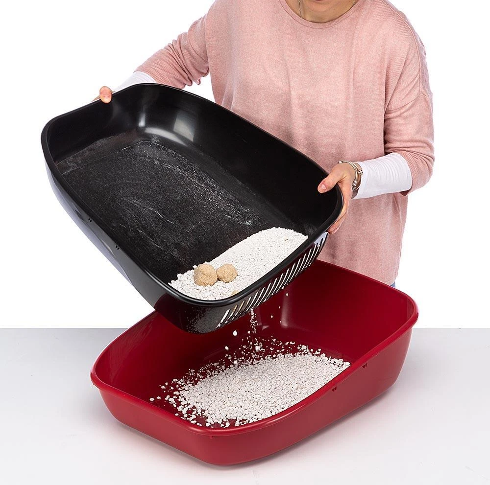 Wanneer je de oude kattenbakvulling moet verwijderen, til je de geperforeerde bodem op en zeef je de bestaande kattenbakvulling. In de zeef blijft de klonterige vulling achter dat moet worden weggegooid, terwijl je in de standaardbodem de nog bruikbare vulling hebt om toe te voegen aan de schone kattenbakvulling.