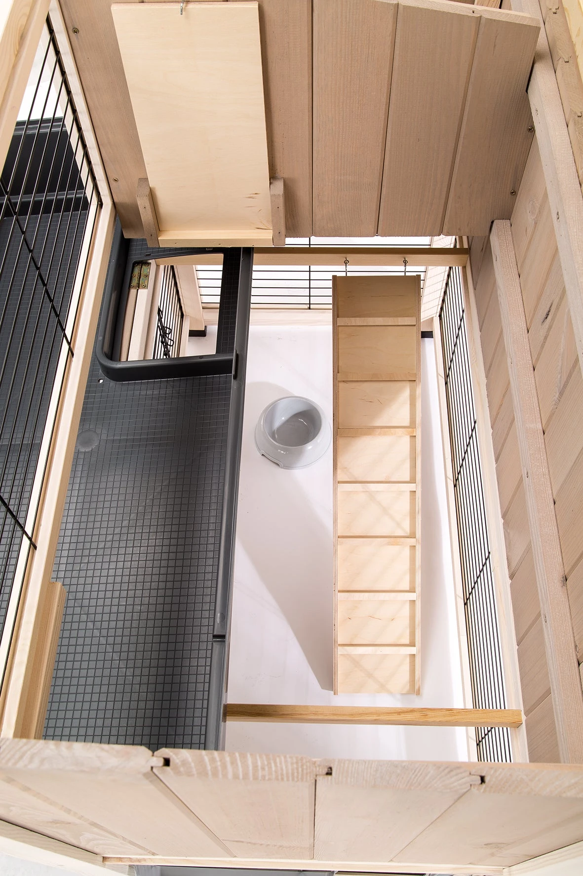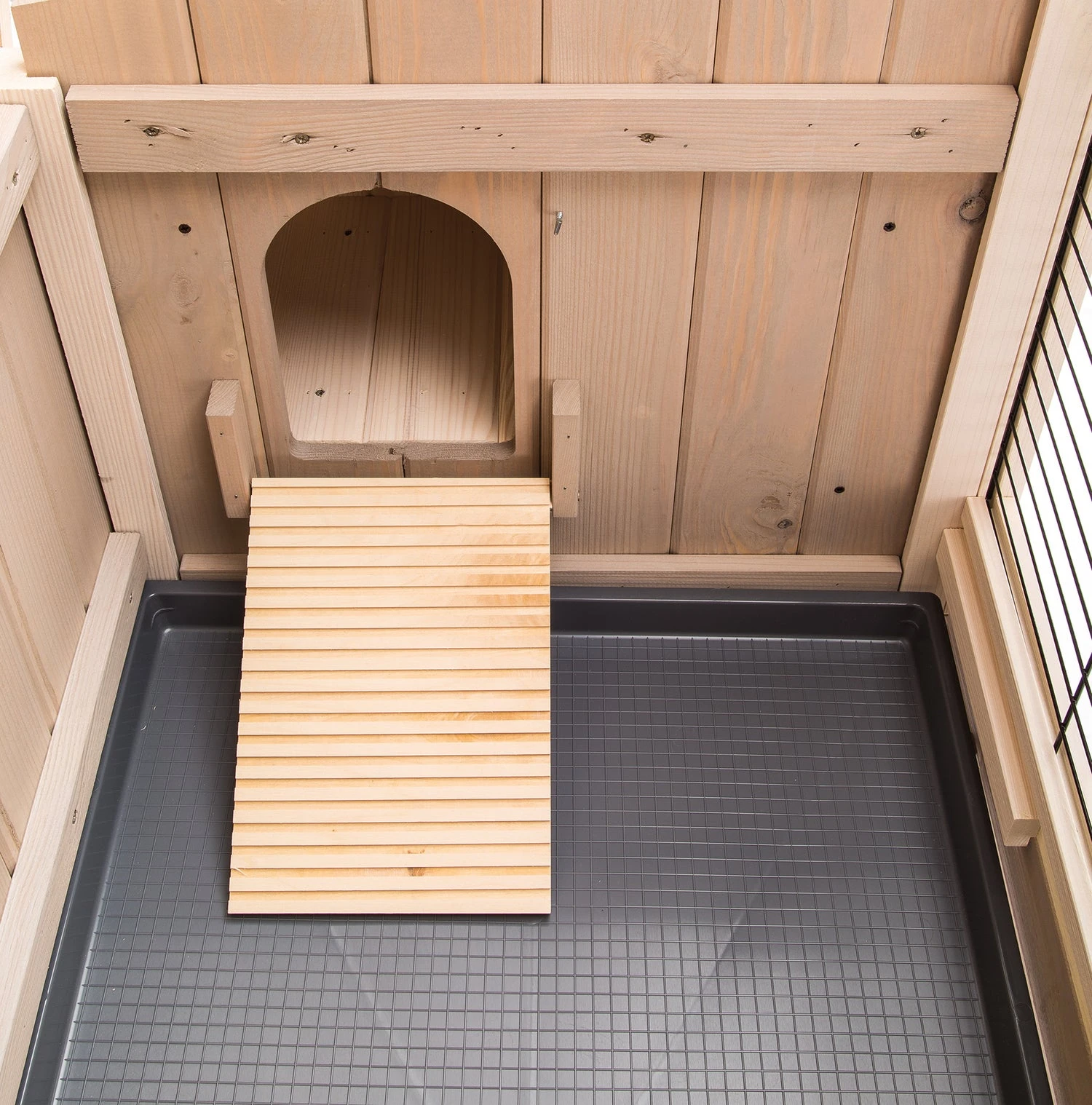 Het konijnenhok wordt geleverd met accessoires. De accessoires zijn een hooiruif, een drinkfles, een voerbak en houten ladders waarmee je konijn gemakkelijk de bovenste verdieping kan bereiken. Zorg ervoor dat deze meegeleverde accessoires altijd beschikbaar zijn in het verblijf van je konijn of knaagdier.