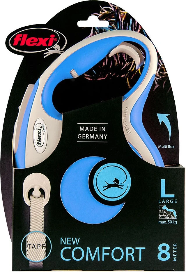 De rollijn New Comfort tape van Flexi is door het perfect afgestemde, tweekleurige design een echte blikvanger. De hondenriem heeft een maximale vrije looplengte van 8 meter en is geschikt voor grote honden tot maximaal 60 kg.