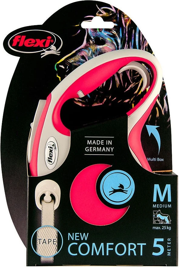 De rollijn New Comfort tape van Flexi is door het perfect afgestemde, tweekleurige design een echte blikvanger. De hondenriem heeft een maximale vrije looplengte van 5 meter en is geschikt voor middelgrote honden tot maximaal 25 kg.