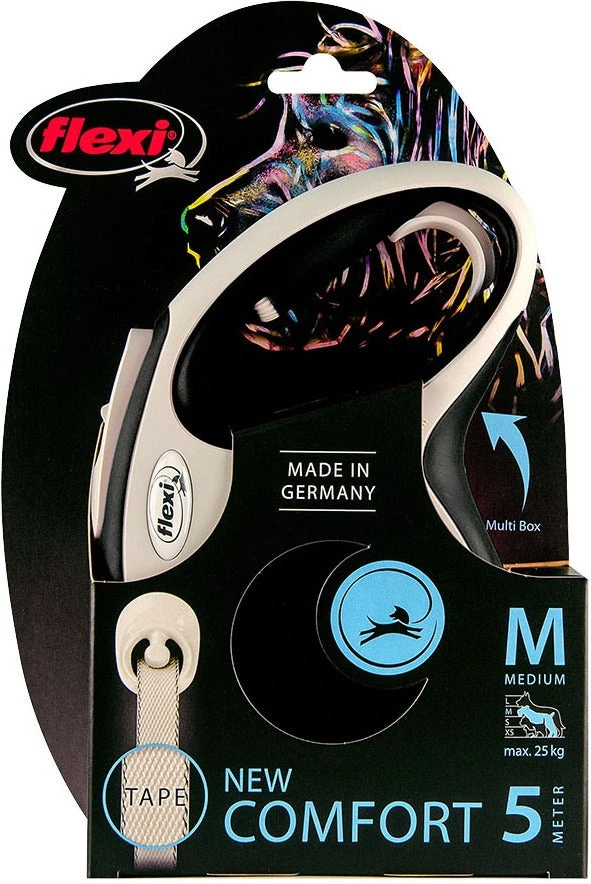 De rollijn New Comfort tape van Flexi is door het perfect afgestemde, tweekleurige design een echte blikvanger. De hondenriem heeft een maximale vrije looplengte van 5 meter en is geschikt voor middelgrote honden tot maximaal 25 kg.