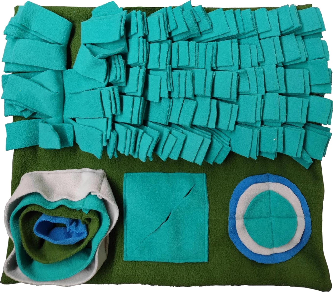 Deze Intratuin activiteitenmat zorgt ervoor dat je hond moet zoeken naar zijn snack, wat hem een goed gevoel geeft. Verstop een hondensnoepje onder een van de flappen en leg de mat op de grond. Je viervoeter gaat nu direct op zoek naar de brokjes en wordt goed aan het denken gezet. Berg de mat na gebruik weer op en geef het na een paar dagen opnieuw. Dat houdt het spannend. Ideaal om de hond op een speelse manier te voeren. Tegen schrokken en verveling. De snuffelmat is gemaakt van polyester en heeft de kleuren groen en grijs. De afmetingen van de mat zijn 40 x 45 cm en de hoogte is ongeveer 6 cm.