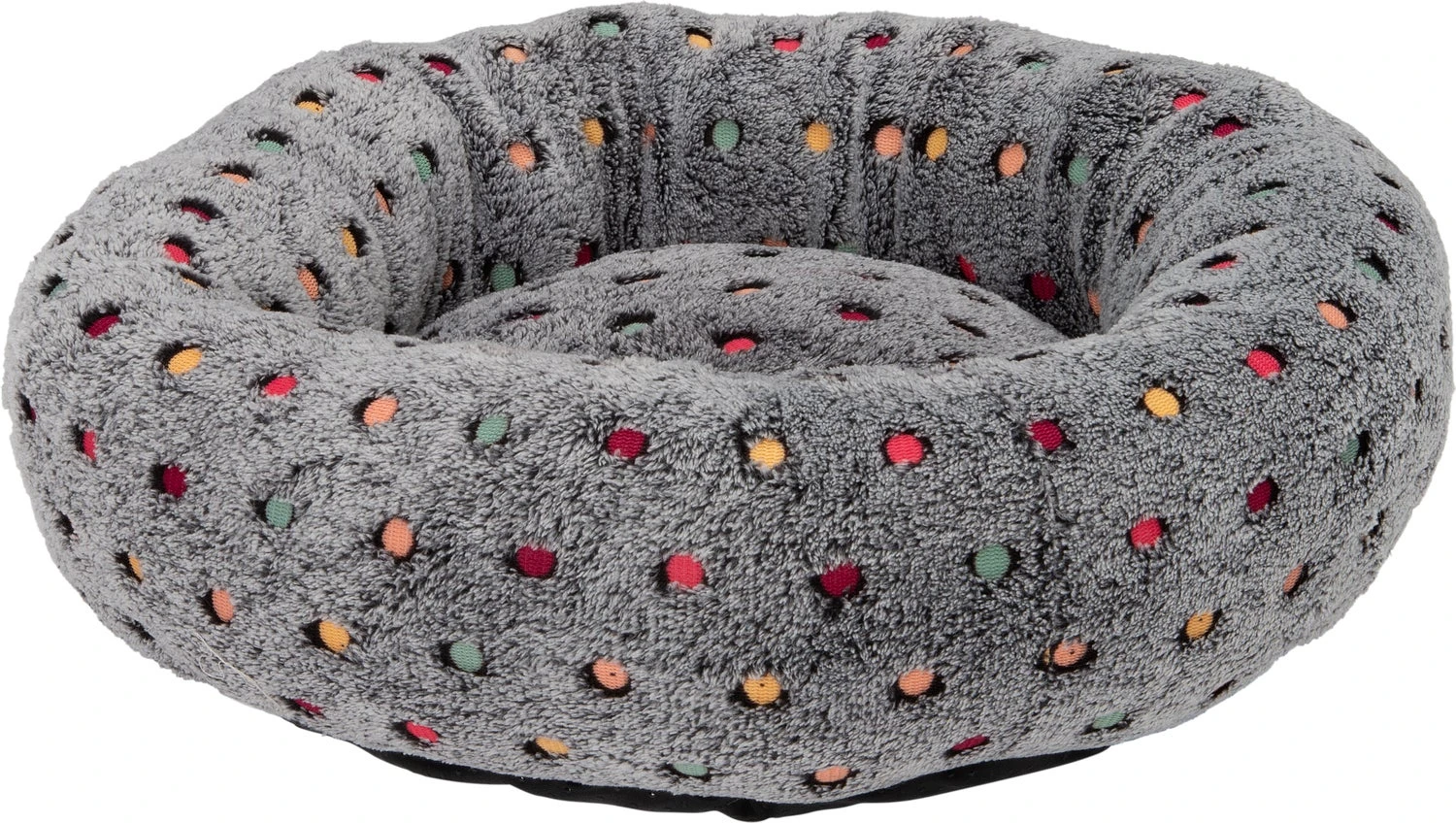 Katten slapen een groot deel van de dag, het is dus wel zo fijn om een comfortabele en warme plek te hebben waar ze hun oogjes dicht kunnen doen. Stip kattenmand is grijs met gekleurde stippen en gemaakt van pluche. De mand heeft een vulling van synthetische vezel.
