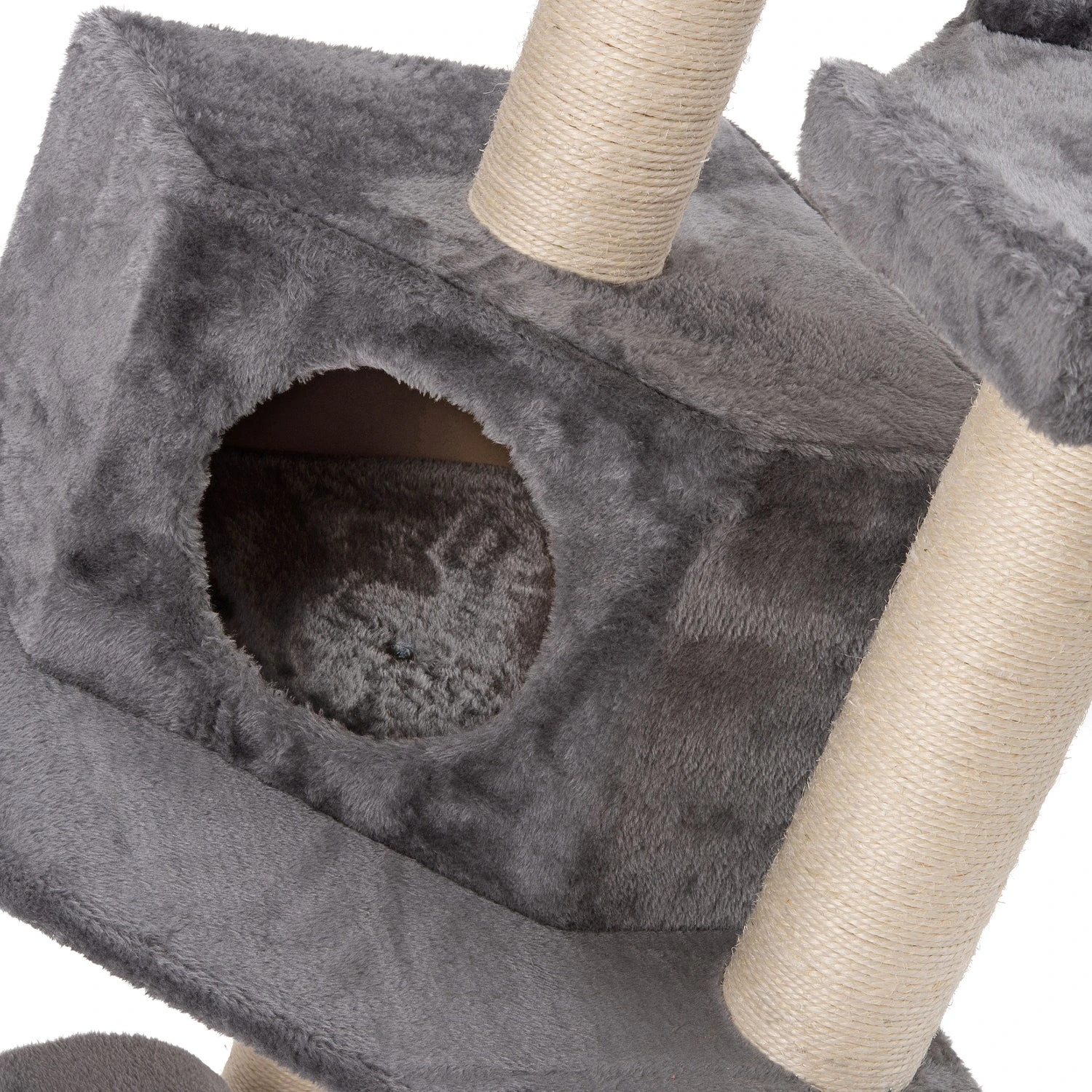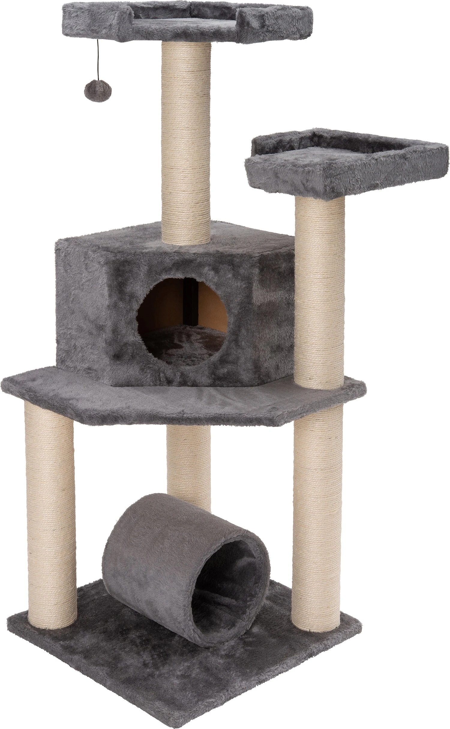 Krabpaal Elise van Intratuin is niet zomaar een krabpaal, het is een heel speel- en rustparadijs voor jouw kat. Het heeft twee hoge plateaus met een opstaand randje, aan één van deze plateaus hangt een balletje waar jouw kat mee kan spelen. In het midden zit een groot plateau met een dichte kattenmand en op de grondplaat is een open cilinder bevestigd om uit te rusten. Door het pluche materiaal is het ook nog eens heerlijk zacht.
