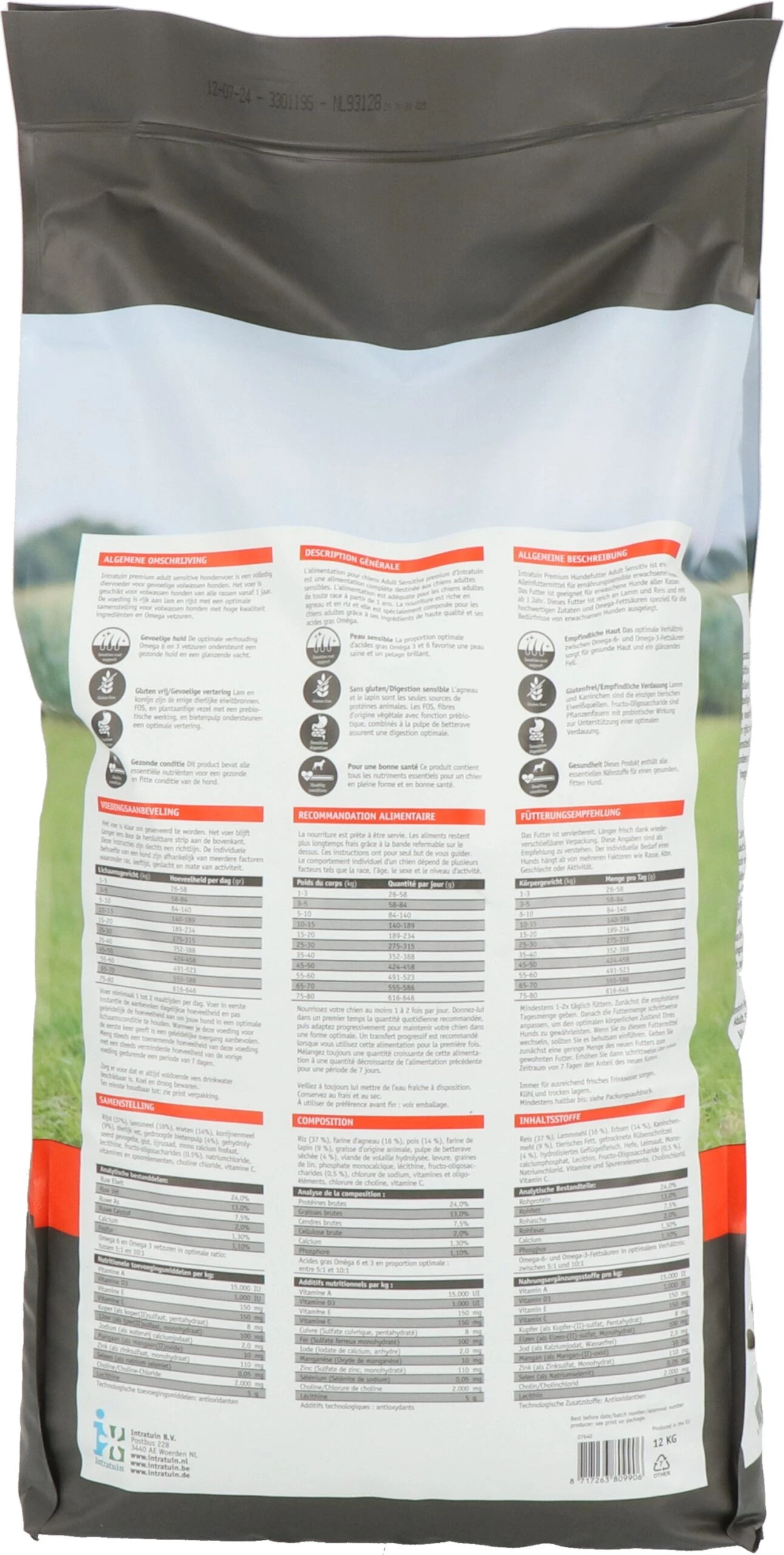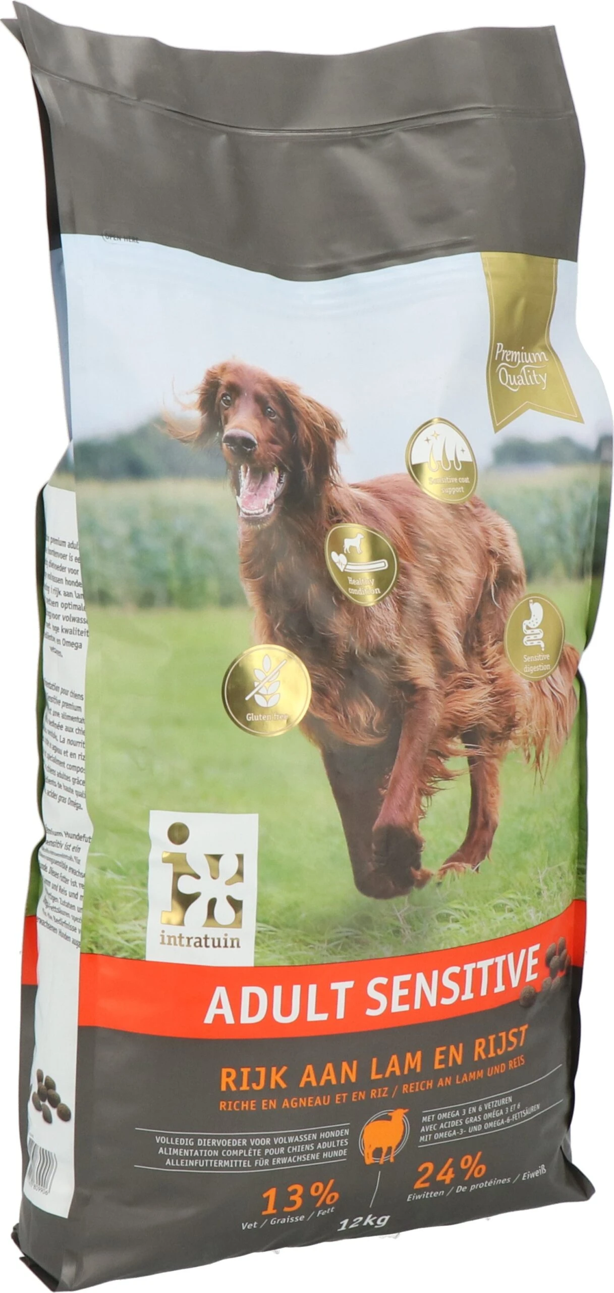 Het Premium hondenvoer adult sensitive van Intratuin is een volledig diervoeder voor gevoelige volwassen honden. Het droogvoer is geschikt voor alle rassen vanaf 1 jaar. De voeding heeft een optimale samenstelling voor gevoelige volwassen honden en is rijk aan lam en rijst. De ingrediënten zijn van hoge kwaliteit en bevatten Omega vetzuren.