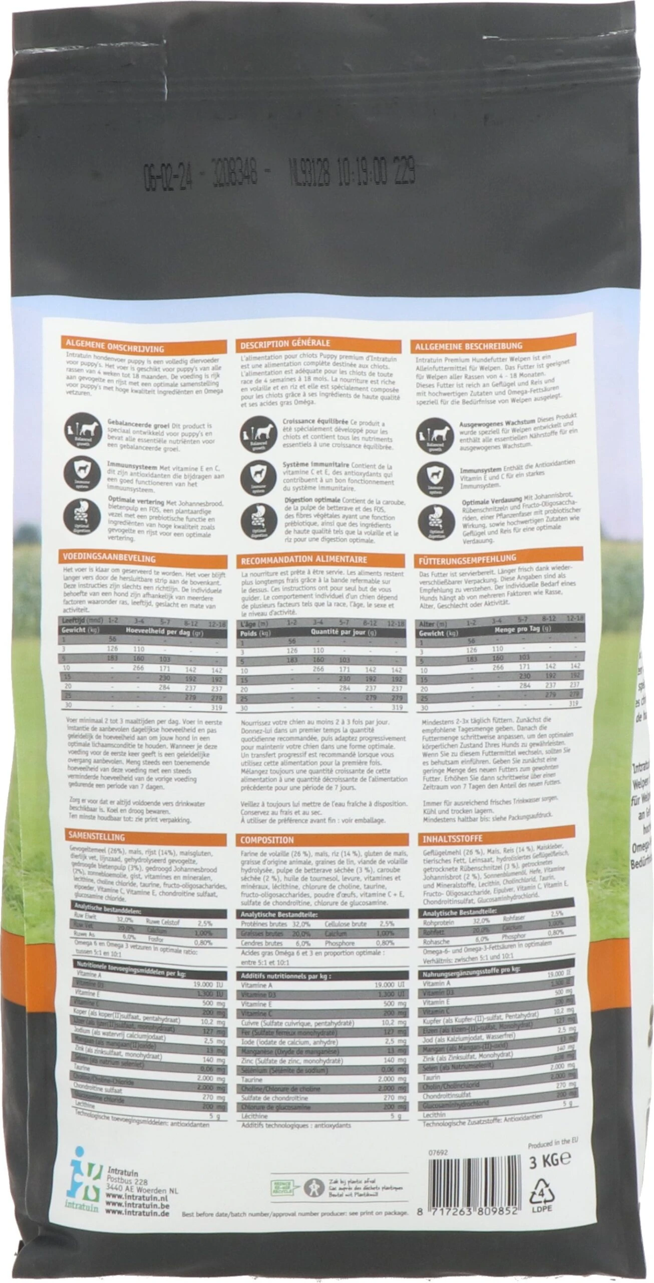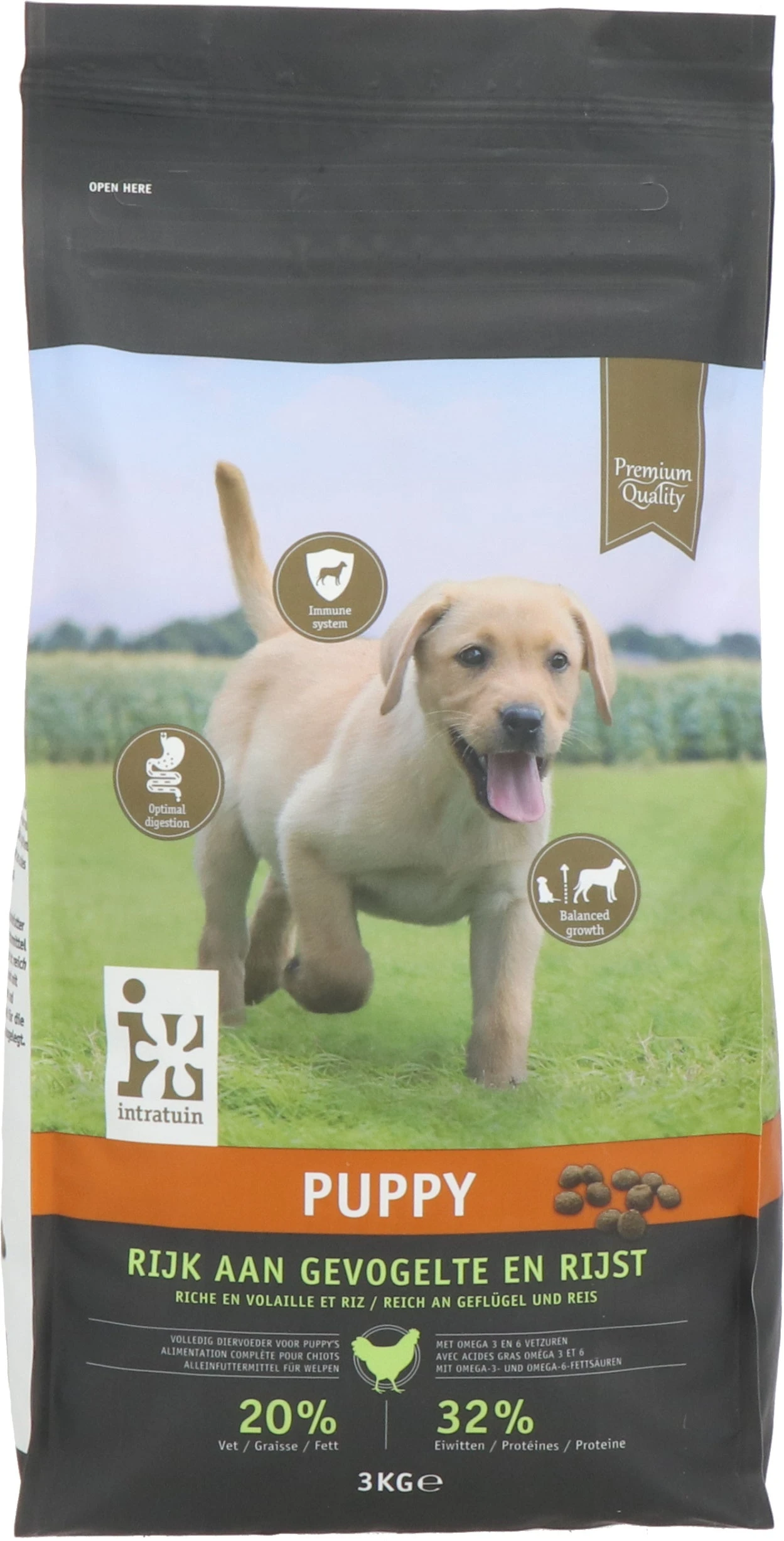 Het Premium puppyvoer van Intratuin is een volledig diervoeder voor puppy’s. Het droogvoer is geschikt voor alle rassen vanaf 4 weken tot 18 maanden. De voeding heeft een optimale samenstelling voor puppy’s en is rijk aan gevogelte en rijst. De ingrediënten zijn van hoge kwaliteit en bevatten Omega vetzuren.