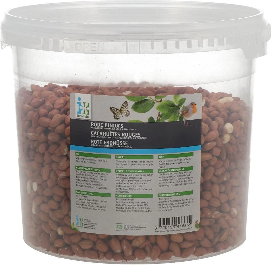 Deze rode pinda’s van Intratuin zijn het best te gebruiken in een pindasilo of op een voedertafel. Door het hoge oliegehalte zijn deze pinda’s zeer geliefd bij onder andere koolmezen, pimpelmezen, mussen en sijzen. Bevat ook een hoog eiwitgehalte om de groei en de algemene gezondheid te bevorderen.