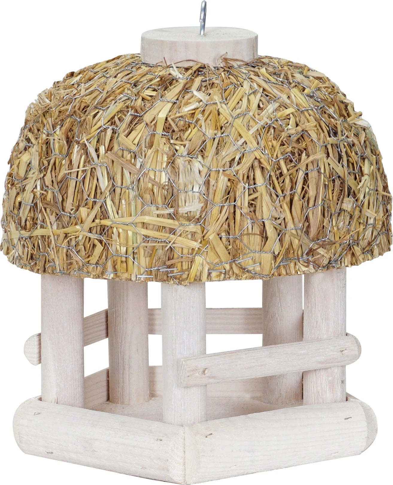 Dit vogelvoederhuis van Intratuin heeft een landelijke uitstraling door het stro op het dak. Het vurenhout is behandeld met een niet giftige houtbeits op waterbasis.