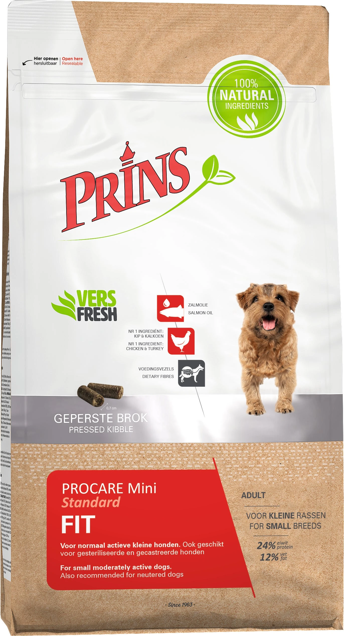 ProCare Mini Standard Fit is een volledige geperste voeding voor volwassen honden van een klein ras met een gemiddeld energieverbruik. Daarnaast is de voeding geschikt voor gesteriliseerde en gecastreerde honden. Dankzij een aangepast energiegehalte helpt deze voeding jouw hond in optimale conditie te blijven. De zorgvuldig geselecteerde ingrediënten dragen bij aan een gezonde huid en glanzende vacht, een optimale vertering en een evenwichtige darmflora.