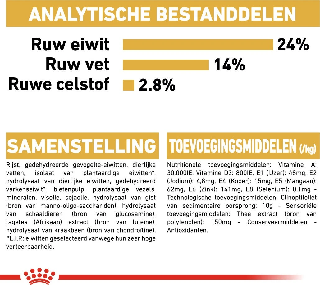 Rijst, gedehydreerde gevogelte-eiwitten, dierlijke vetten, isolaat van plantaardige eiwitten*, hydrolysaat van dierlijke eiwitten, gedehydreerd varkenseiwit, bietenpulp, mineralen, plantaardige vezels, visolie, sojaolie, hydrolysaat van gist (bron van Man