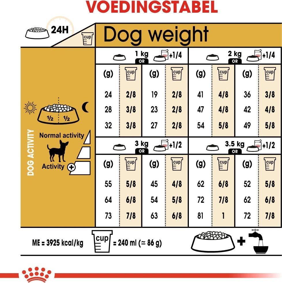Als het op de gezondheid van jouw volwassen Chihuahua aankomt, is voeding een belangrijke factor. Een complete en uitgebalanceerde hondenvoeding vol met voedingsstoffen die zijn gezondheid ondersteunen, is onmisbaar. Royal Canin Chihuahua Adult is geschikt voor Chihuahua’s van 8 maanden en ouder en is speciaal ontwikkeld met de voedingsbehoeften van een volwassen Chihuahua.