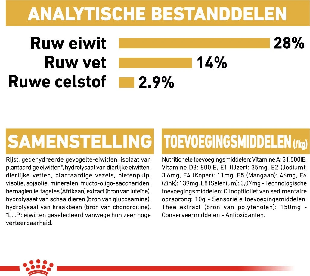 Royal Canin Dachshund Adult draagt bij aan de ondersteuning van de botten en gewrichten van de Dashond dankzij een aangepast calcium- en fosforgehalte. Deze exclusieve formule helpt ook het ideale gewicht te behouden. Deze formule helpt de spierspanning van de Dashond te behouden en helpt daarnaast de geur en de hoeveelheid van de ontlasting te verminderen. De brokjes zijn speciaal ontwikkeld en bevatten calciumvangers die helpen de vorming van tandsteen te verminderen.