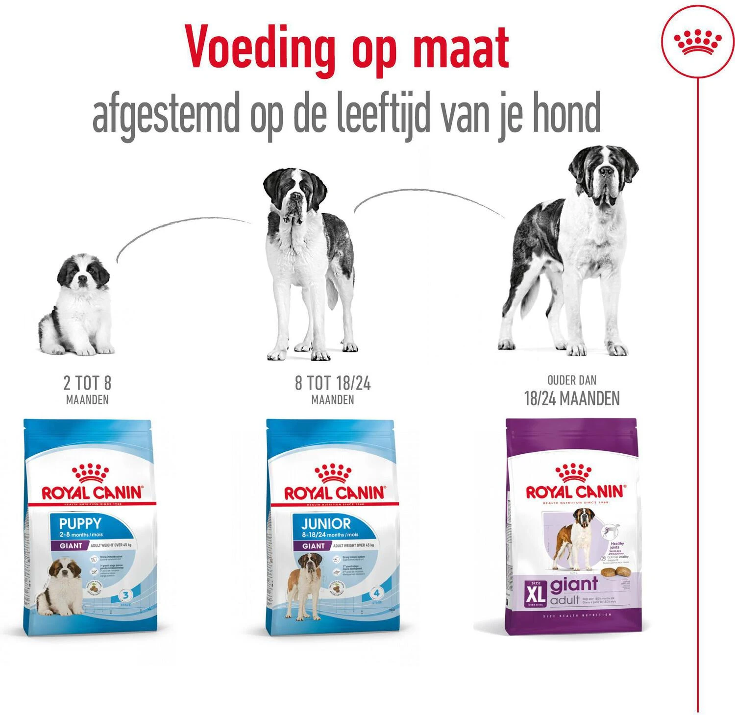 Honden van zeer grote rassen kunnen tot wel 100 kg wegen. Het is belangrijk dat zij de juiste voedingsstoffen binnenkrijgen ter ondersteuning van hun botten en gewrichten. Royal Canin Giant Adult is geschikt voor volwassen honden met een lichaamsgewicht van 45 kg of meer en is samengesteld met de voedingsbehoeften van honden van zeer grote rassen.