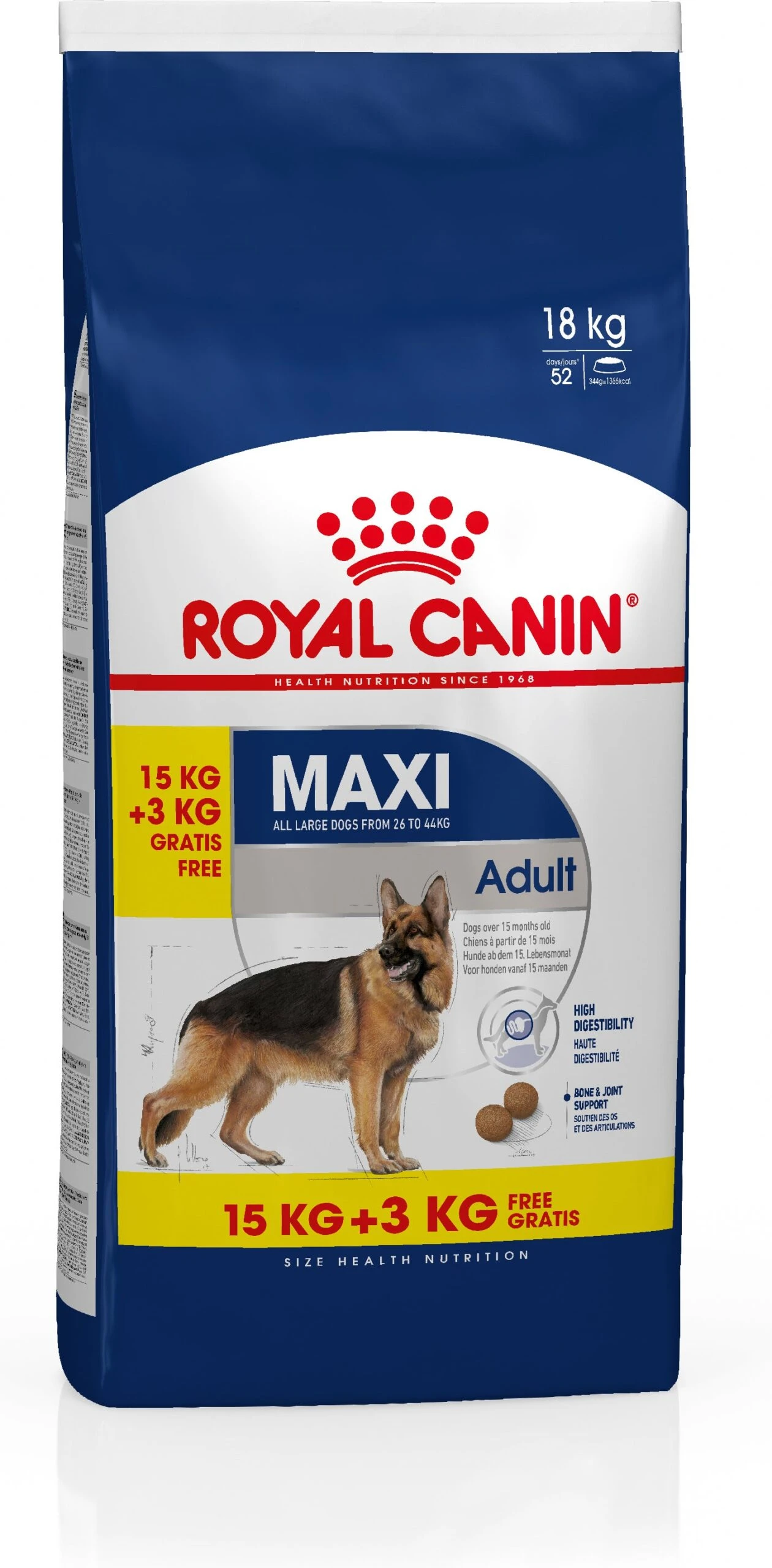 Royal Canin Maxi Adult, inhoud 15 kg + 3 kg gratis. Volledige en uitgebalanceerde voeding voor volwassen honden van grote rassen (gewicht van 26 t/m 44kg) vanaf 15 maanden.