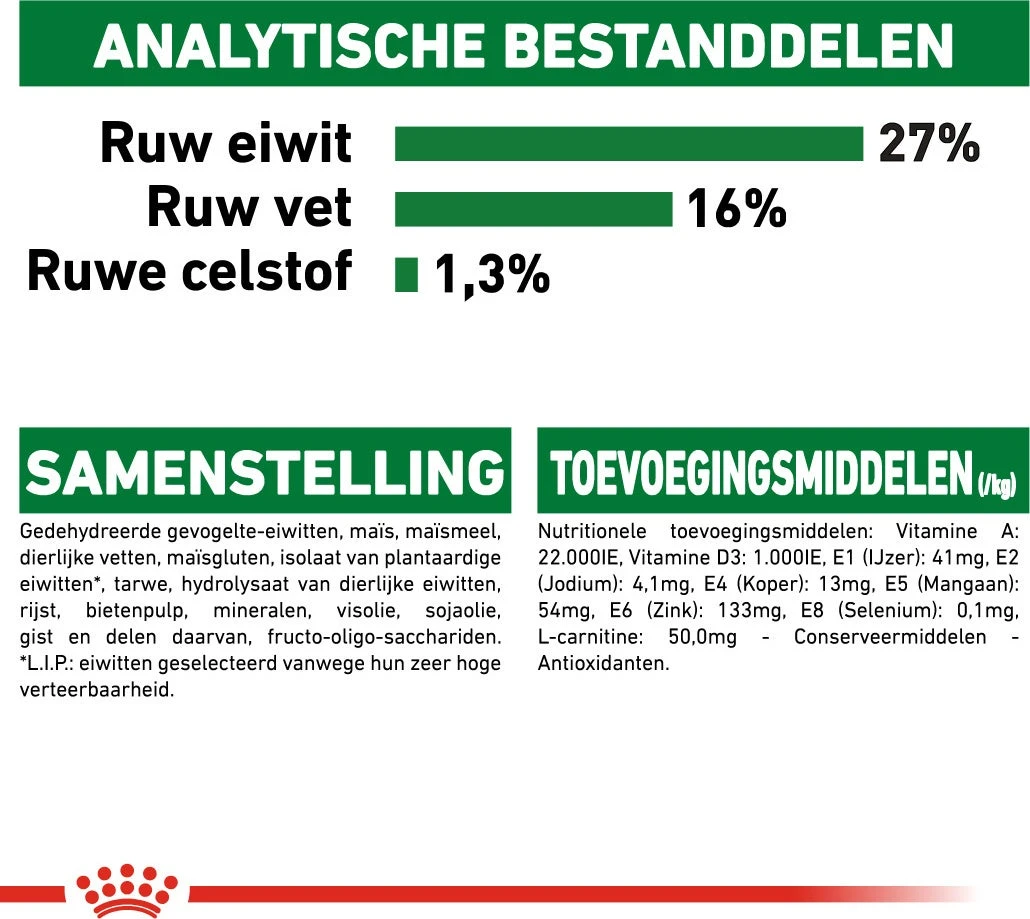 Honden van een klein ras hebben over het algemeen een hoge energiebehoefte. Royal Canin Mini Adult is speciaal samengesteld met voedingsstoffen die daaraan tegemoet komen en helpt hem een gezond gewicht te behouden. De voeding bevat L-Carnitine. Sommige kleine honden zijn kieskeuriger dan anderen. Royal Canin Mini Adult is extra smakelijk door een selectie van exclusieve aroma’s, die zelfs de meest kieskeurige eter wel zullen bevallen.