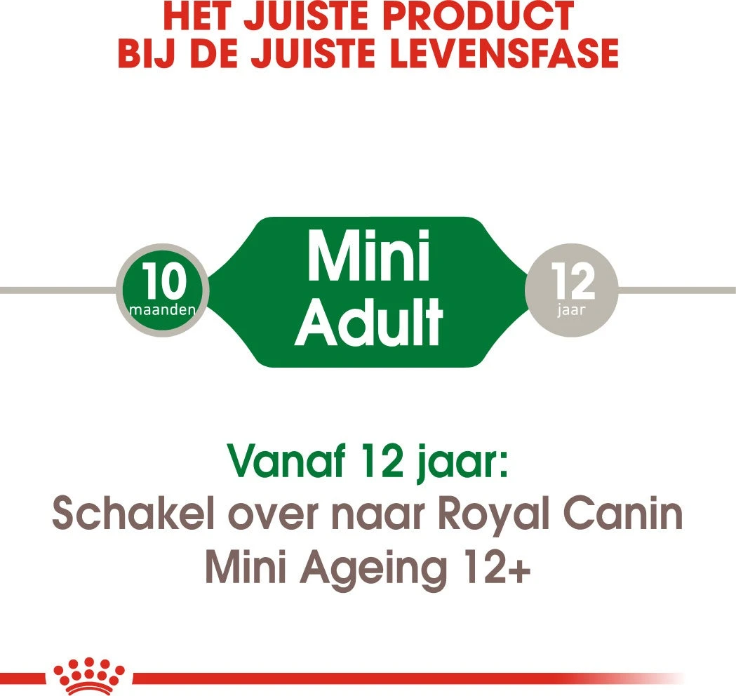 Mini Adult natvoer is geschikt voor kleine honden vanaf een leeftijd van 10 maanden tot 12 jaar en een lichaamsgewicht tot maximaal 10 kilogram.