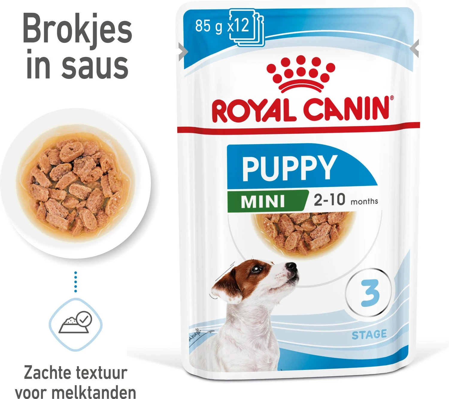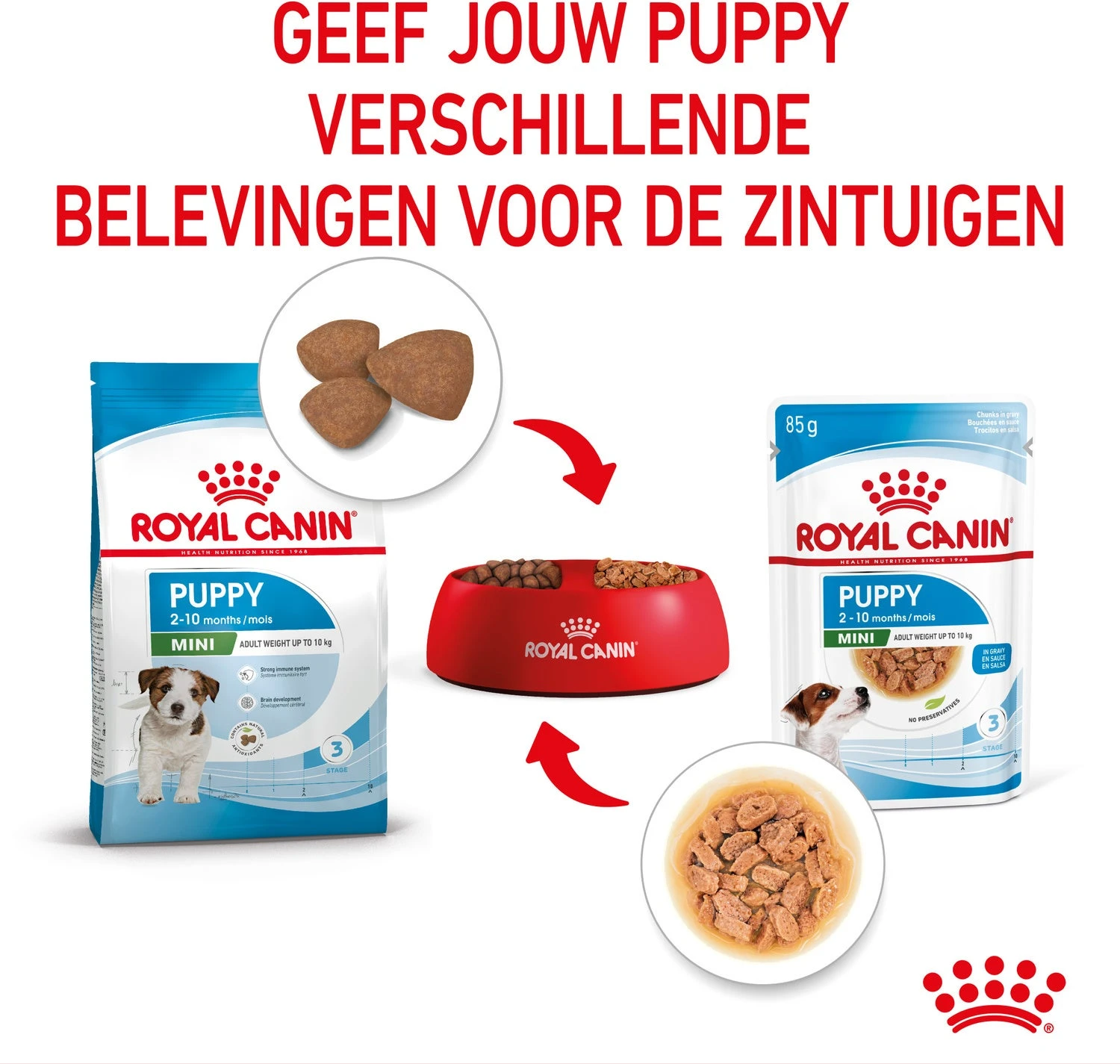 Mini Puppy natvoer van Royal Canin is geschikt voor pups tot een leeftijd van 10 maanden, met een volwassen gewicht tot maximaal 10 kilogram, en is ontwikkeld met de voedingsbehoeften van jouw puppy in het achterhoofd.
