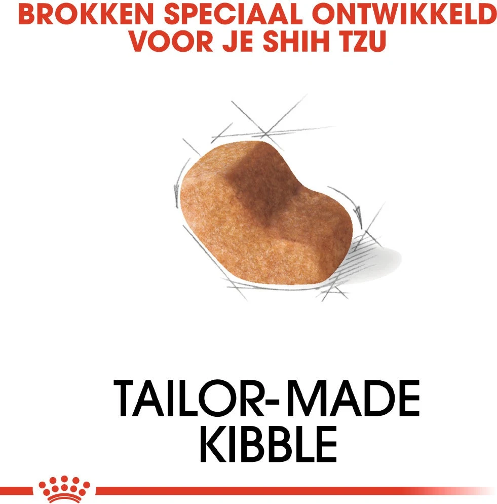 De schedel van de Shih Tzu is breder dan lang. De brokjes van Royal Canin Shih Tzu Adult zijn speciaal ontwikkeld voor de Shih Tzu. De vorm en grootte zijn zo aangepast dat deze gemakkelijk voor jouw hond zijn op te pakken en te kauwen.