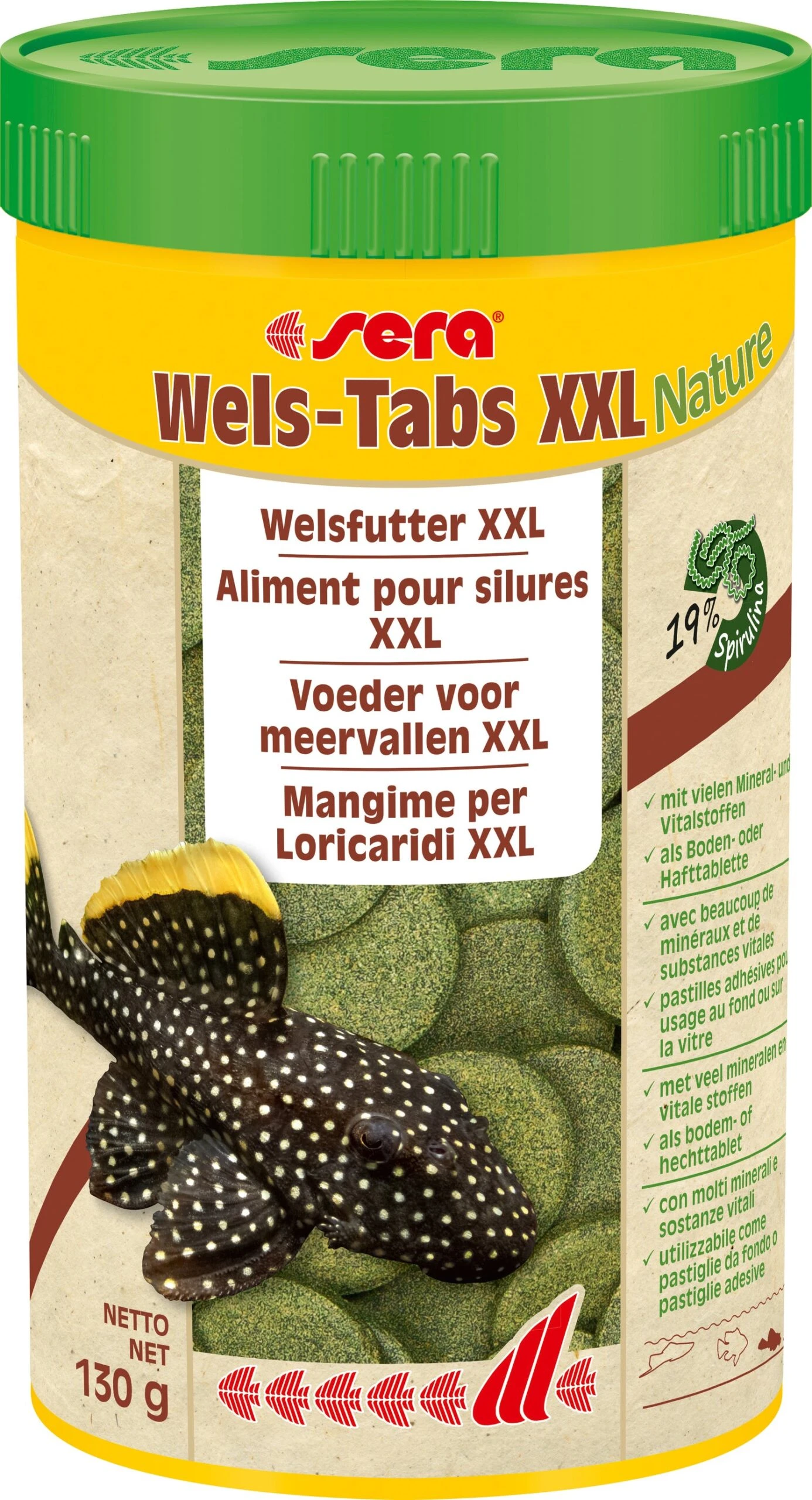 Sera Wels-Tabs XXL Nature is het hoofdvoeder zonder kleur- en conserveermiddelen voor grotere meervallen (bijv. Plecos) en andere bodemvissen. De grote tabs kunnen ook aan de aquariumruit geplakt worden. Dit soort voeden biedt fascinerende observatiemogelijkheden van de verschillende siervissoorten.