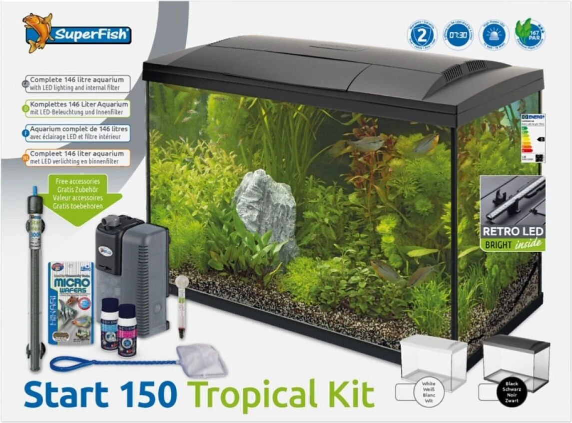 Dit aquarium voor tropische vissen is uitermate geschikt voor beginners en gevorderden! De SuperFish Start 150 Tropical kit is een complete starterskit met energiezuinige LED-verlichting, binnenfilter en handige accessoires om een nieuw aquarium te beginnen.