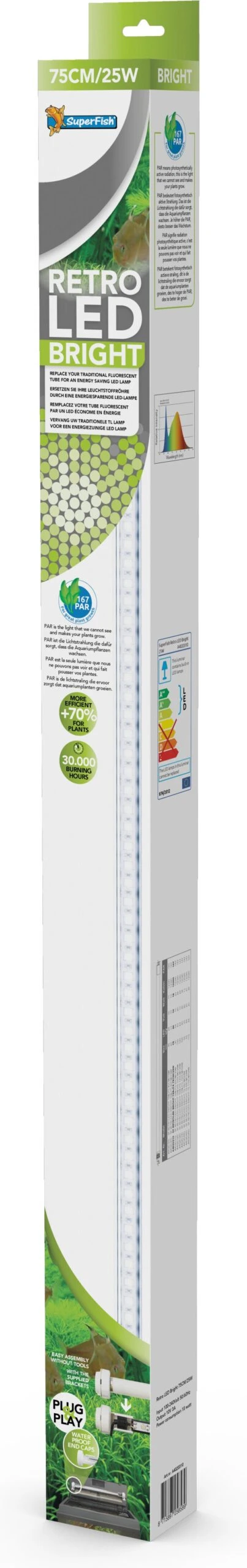 De SuperFish Retro LED lamp Bright past perfect in een T8 of T5 aquarium armatuur en kan ook als extra verlichting of boven zelfbouw-aquaria worden toegepast. LED heeft een veel langere levensduur dan traditionele TL-lampen en verbruikt tot 50% minder energie.