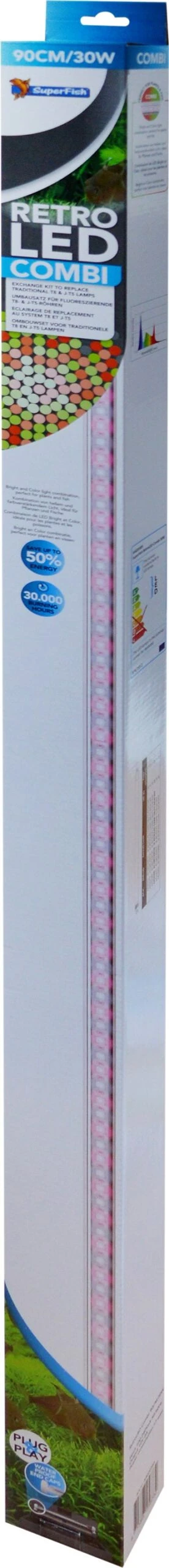 De aquarium verlichting Retro LED Combi van SuperFish past perfect in een T8 of T5 aquarium armatuur en kan ook als extra verlichting of boven zelfbouw-aquaria worden toegepast. LED heeft een veel langere levensduur dan traditionele TL-lampen en verbruikt tot 50% minder energie.