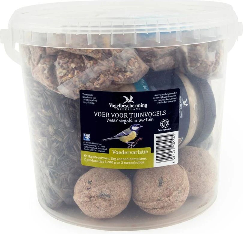 Deze tuinvogelvoer variatie emmer van CJ Wildlife bevat 1 kg strooivoer, 1 kg zonnebloempitten, vogelpindakaas en drie vetbollen à 90 g. Dit kan het hele jaar door aangeboden worden.