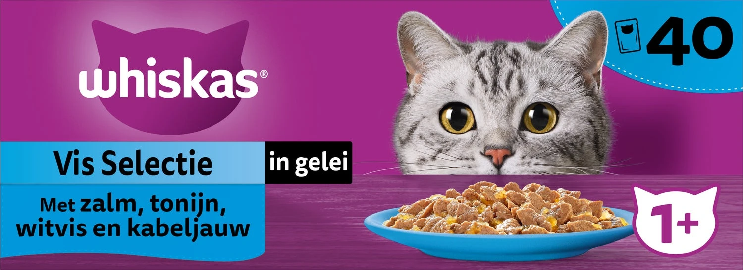 | Ingrediënten | Met zalm: vlees en dierlijke bijproducten (33%), vis- en bijproducten (waarvan 4% zalm in de brokken*), granen, mineralen, plantaardige bijproducten, suikers. *Brokken meestal 40% van het product., Met tonijn: vlees en dierlijke bijproducten (33%), vis- en bijproducten (waarvan 4% tonijn in de brokken*), granen, mineralen, plantaardige bijproducten, suikers. *Brokken meestal 40% van het product., Met witvis: vlees en dierlijke bijproducten (33%), vis- en bijproducten (waarvan 4% witvis in de brokken*), granen, mineralen, plantaardige bijproducten, suikers. *Brokken meestal 40% van het product., Met kabeljauw: vlees en dierlijke bijproducten (33%), vis- en bijproducten (waarvan 4% kabeljauw in de brokken*), granen, mineralen, plantaardige bijproducten, suikers. *Brokken meestal 40% van het product. |