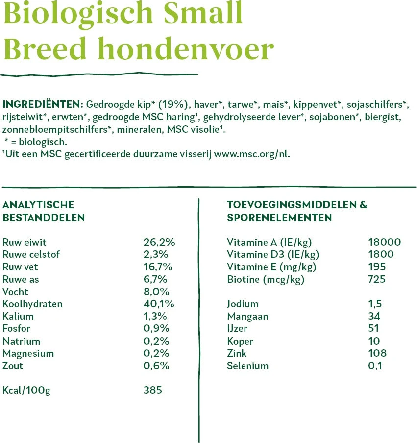 Brokken met biologische kip, MSC-vis en biologische erwten voor kleine hondenrassen. Het biologische hondenvoer vormt een complete, voedzame en zeer smakelijke maaltijd voor je kleine, opgroeiende of volwassen hond.