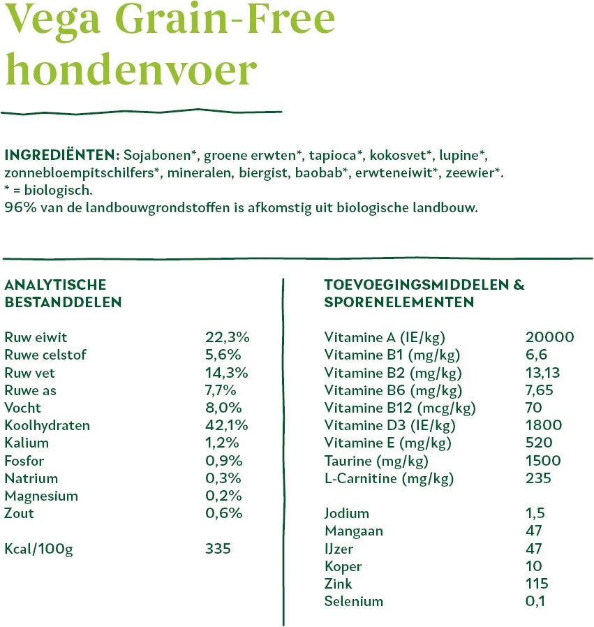Vegetarische en graanvrije brokken met biologische sojabonen, erwten, tapioca, witte lupine en zeewier voor volwassen honden. Het biologische hondenvoer vormt een complete, voedzame en zeer smakelijke maaltijd, vervaardigd met de beste vegetarische ingrediënten. Ideaal voor honden die moeite hebben met dierlijke eiwitten en granen.